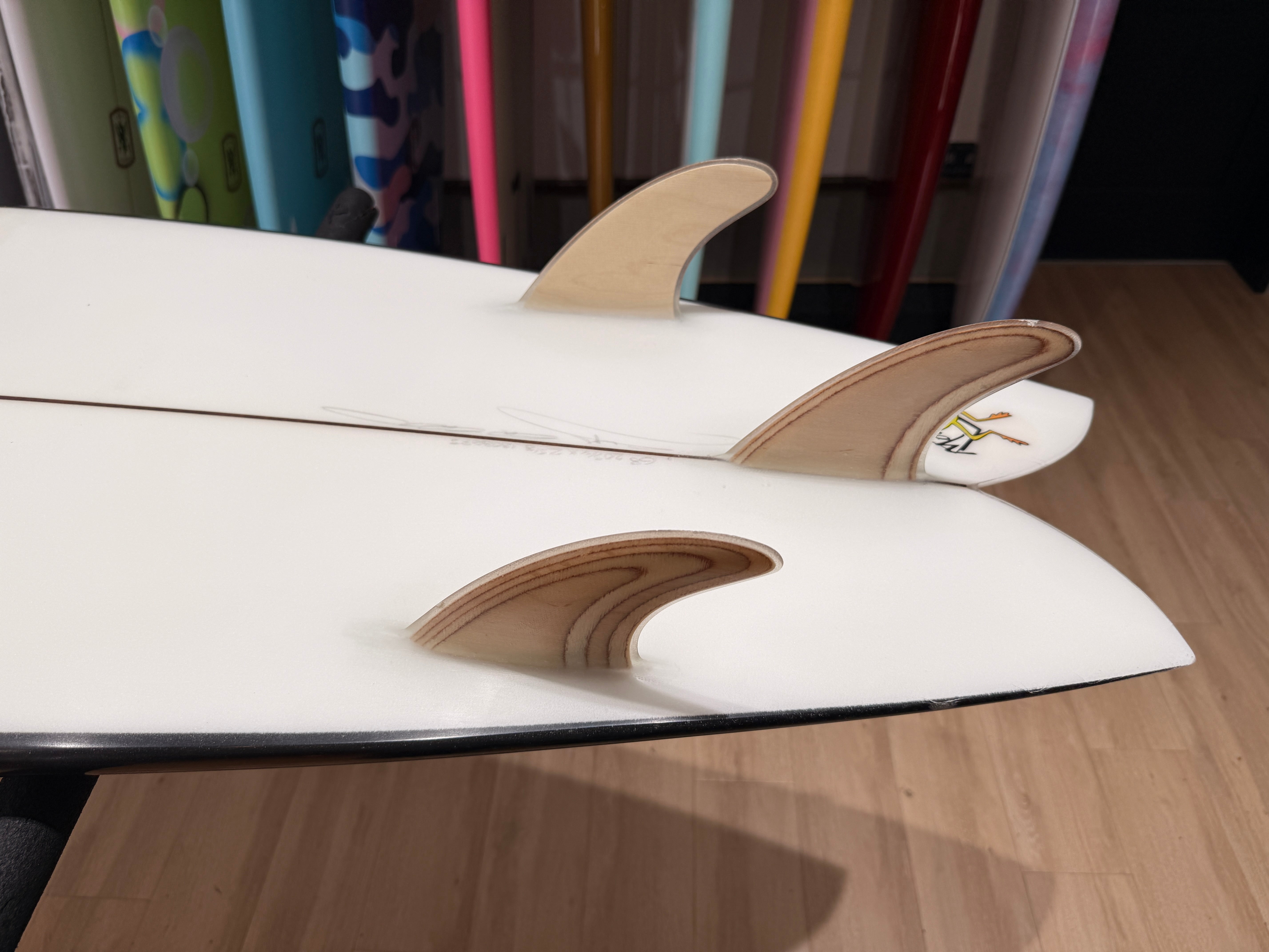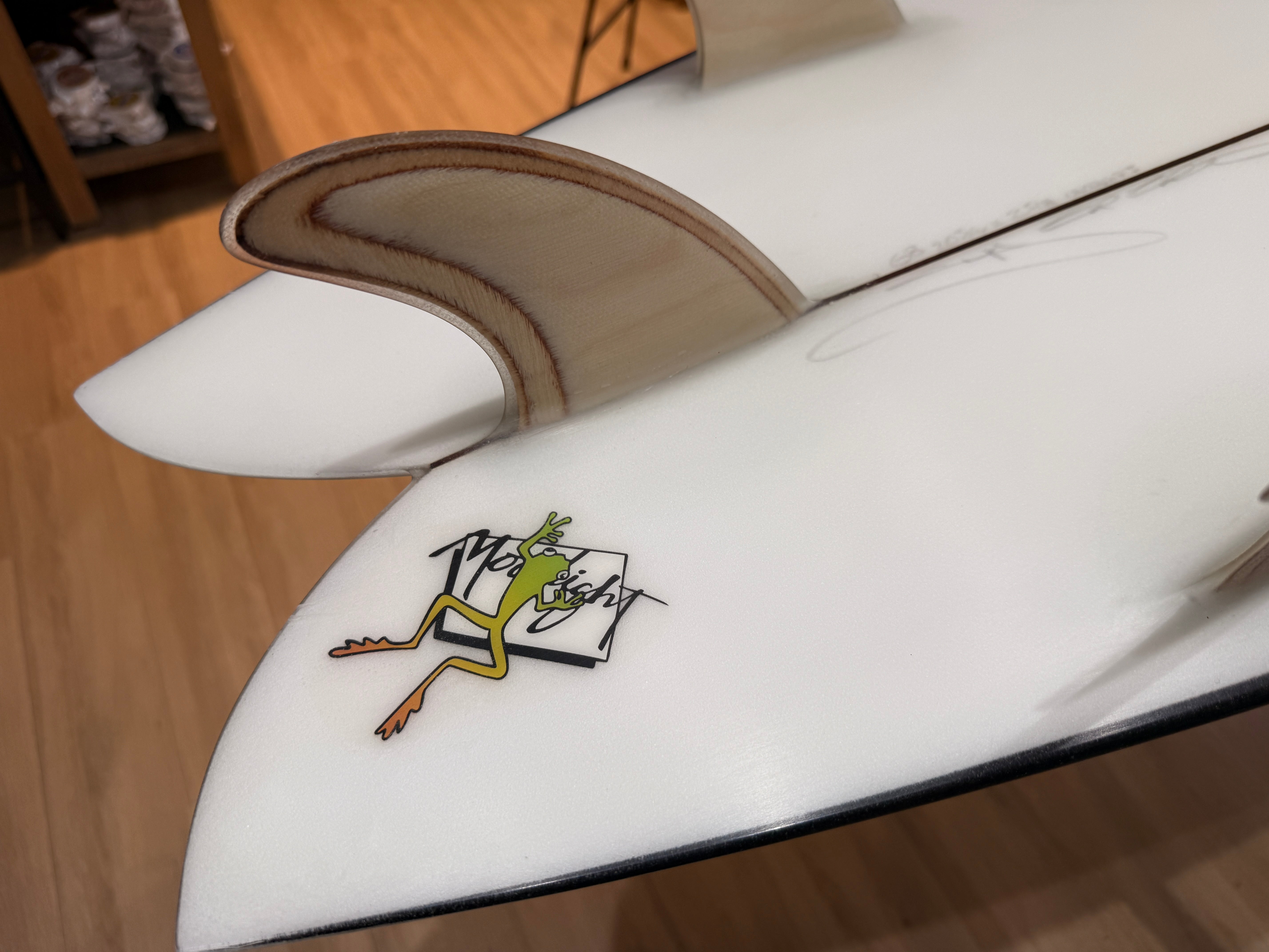 ■ フィンについて 今では非常に珍しい、ウッド素材のトライフィンがグラスオンされています。オンフィン特有の構造的な強さとダイレクトな反応、そしてウッドの絶妙なしなりが、ノーチラス本来のハイスピードな走りとスムースなレールワークをより高い次元で実現します。