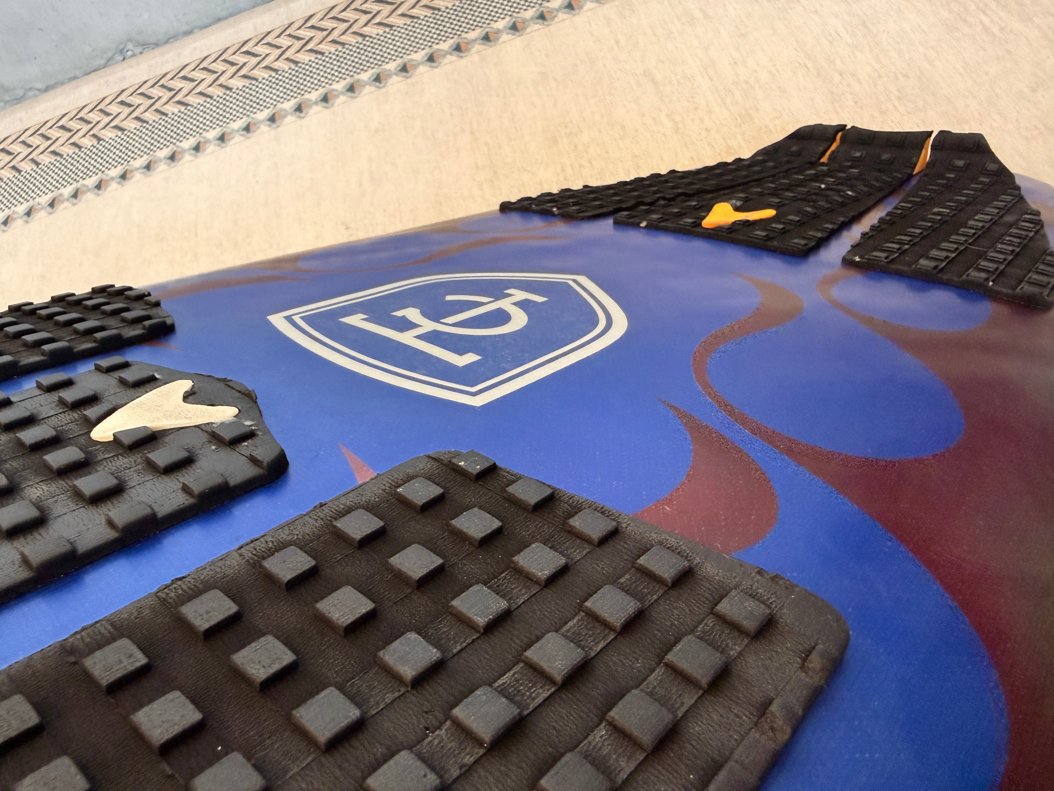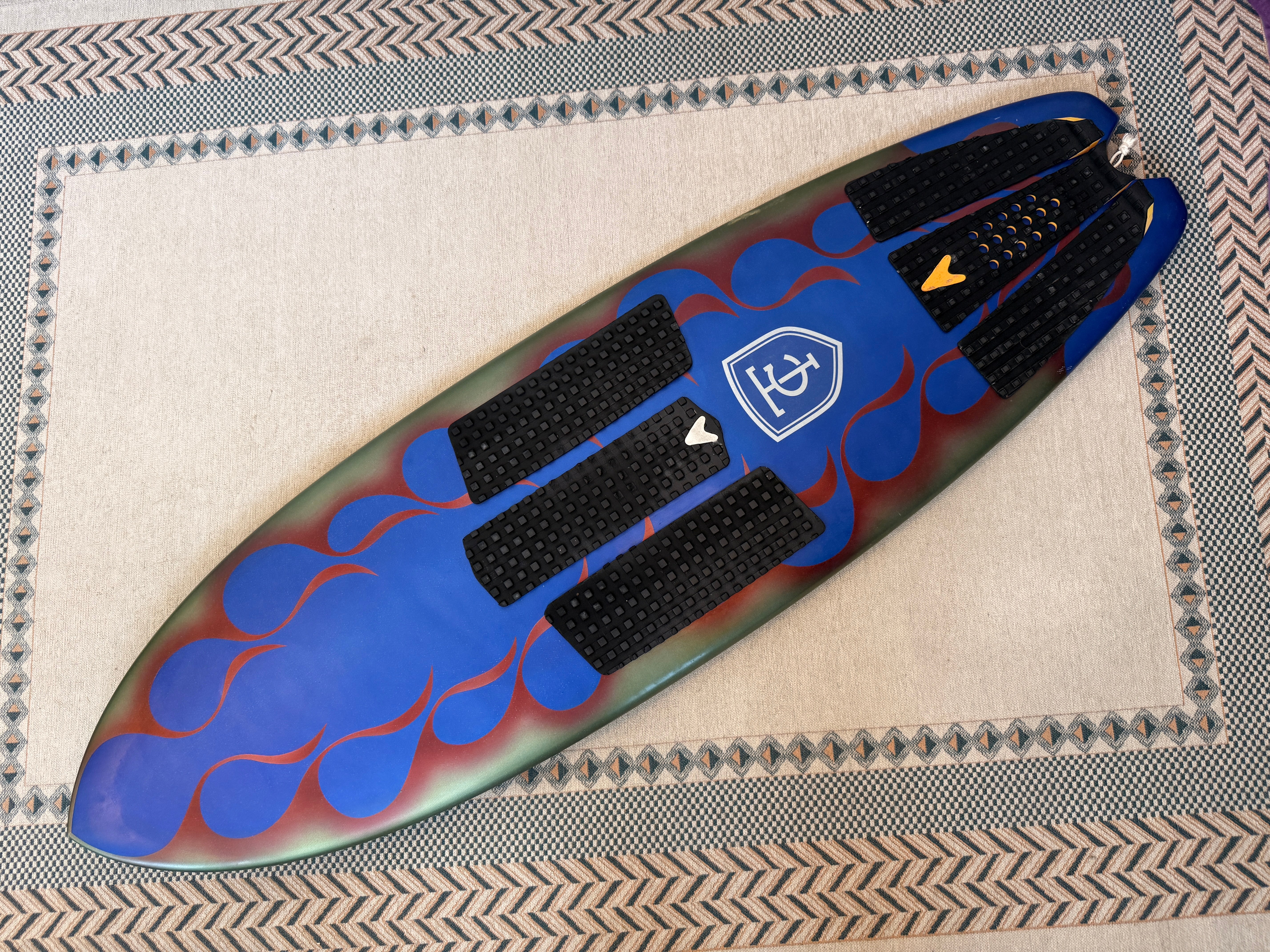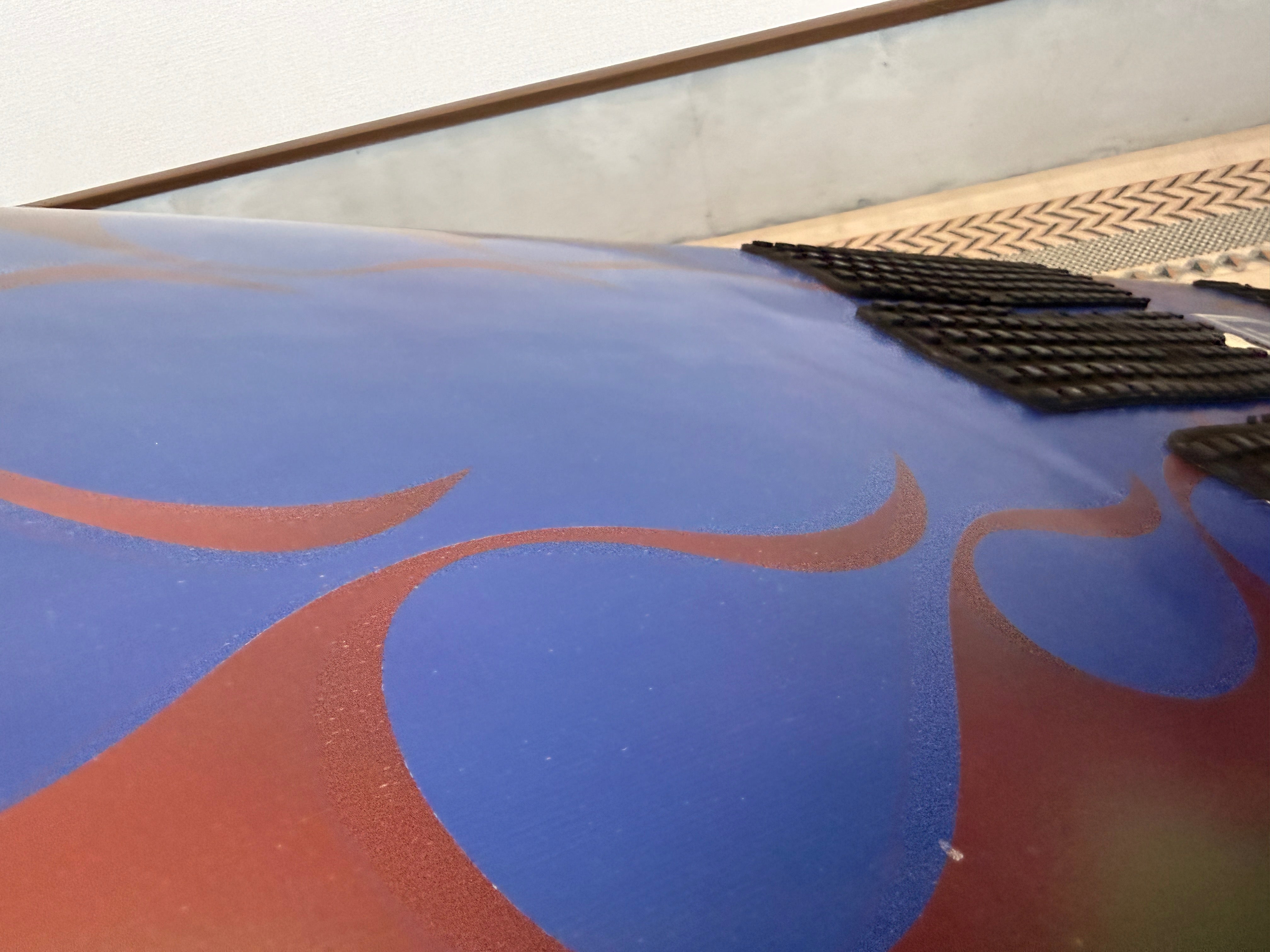 このボードの目を引くポイントは、Yoshiroのマスキング技術が光るファイヤーパターンのスプレーアートです。Yoshiroはシェイピングからラミネート、エアブラシアートワークまで一貫して手掛けるクラフトマンですが、このファイヤーパターンは緻密なマスキング作業の積み重ねによって生まれるもの。シェイパー本人のパーソナルボードだからこそ、時間を惜しまず仕上げたアートワークです。